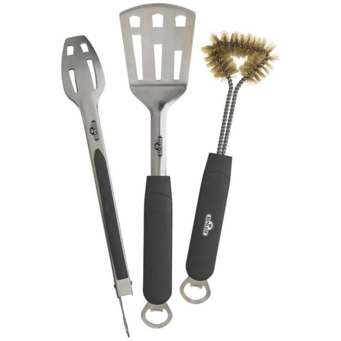 Il set di utensili Travel Q è costituito da una spatola angolata, una pinza bloccabile e una spazzola in ottone.
