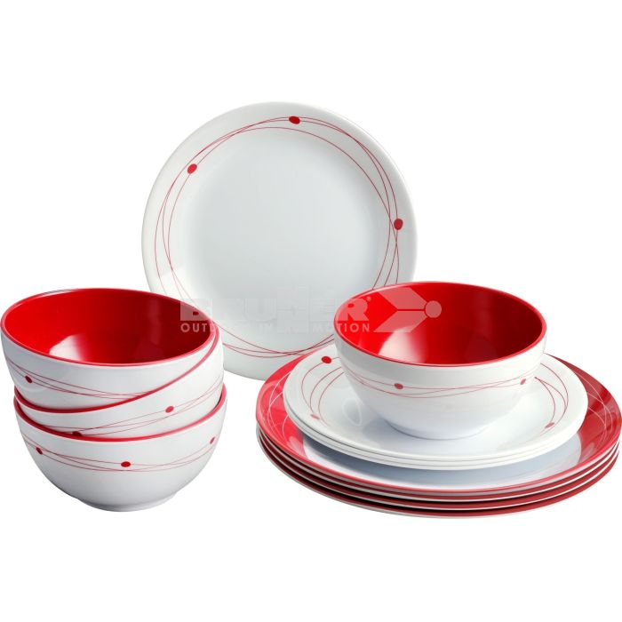 La confezione è composta da: 4 piatti piani dal diametro di 25 cm, 4 piatti dessert dal diametro di 20 cm e 4 piatti fondi dal diametro di 15 cm .