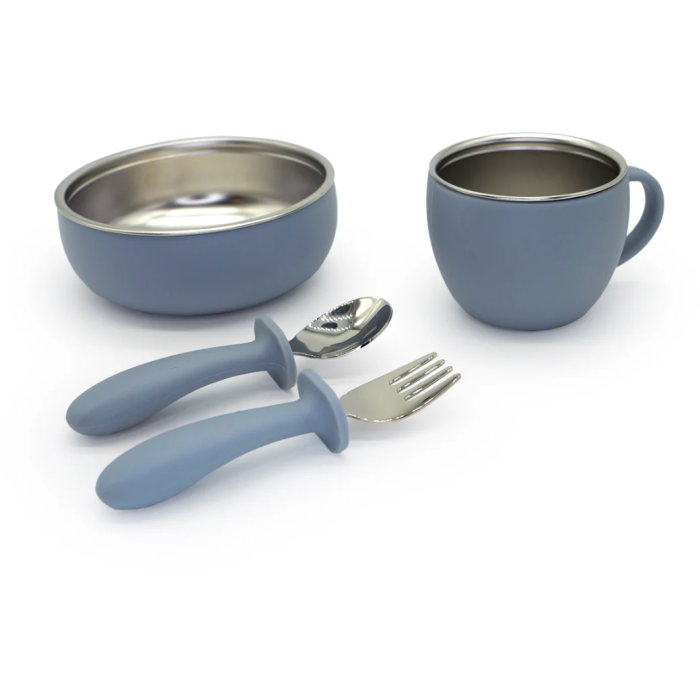 Il set pappa Taiki Steel è composto da una ciotola, un bicchiere, una forchetta e un cucchiaio perfetto per l'ora trasformare l'ora del pappa in un momento divertente.